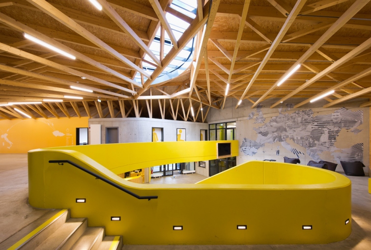 The central atrium is a hub for offline and online entertainment, interaction and communication. A skylight provides natural daylight to a central amphitheatre that connects the different levels, whilst horizontal and diagonal sightlines direct guests to different building functions.