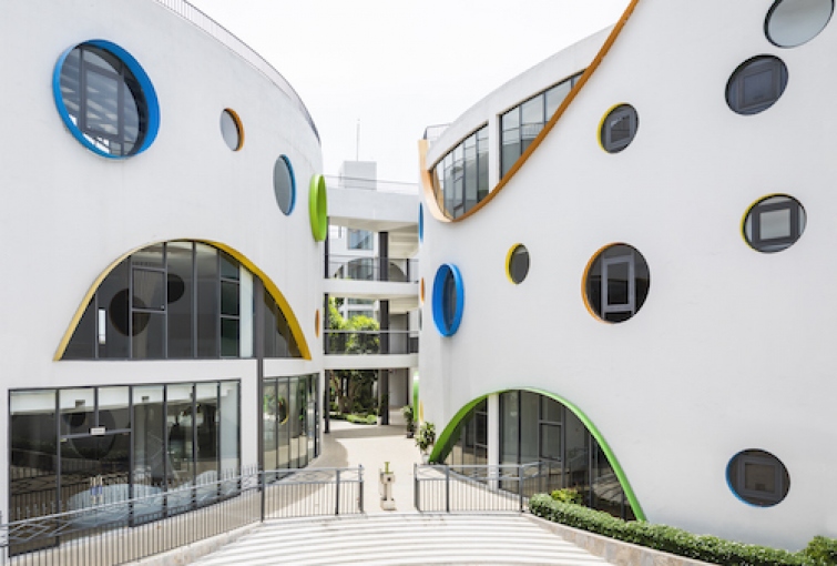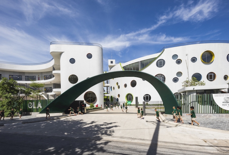 The kindergarten near Hanoi, Vietnam, unfolds with three semi-circular buildings over three levels linked by bridges generating a series of interconnected indoor and outdoor spaces that are playful and safe while making an architectural statement. The series of buildings form three courtyards with a forest in between, with breezes from the adjacent lake adding to the natural experience.
