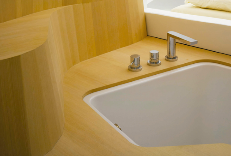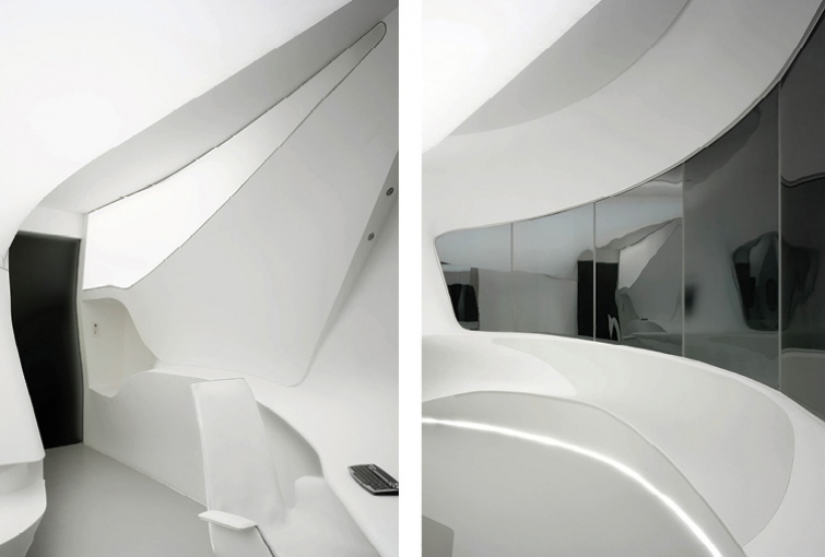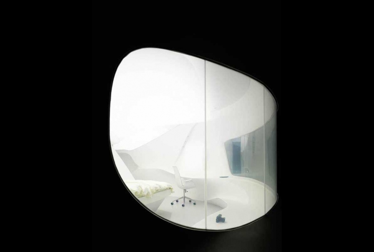 Anti-jet-lag lights, an active comfort bed, personal spa area, intelligent mirror and fully integrated media meet the needs of tomorrow’s hotel guests. The free-form outer skin is the interface between technology and the human body. Human